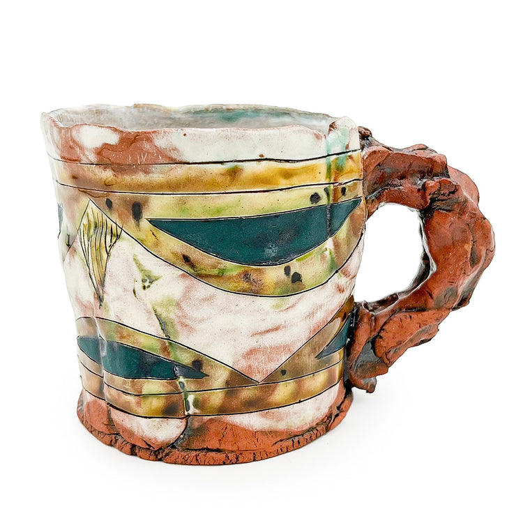 Amanda Dobbratz graduated with a Masters in Research in creative practice from Glasgow School of Art (UK). Previously, she received a BFA in studio art from the University of Wisconsin–Stout. Dobbratz was a lead artist at the Watershed Artists Inviting Artists summer residency program (Newcastle, ME) in 2019 and an invited artist in 2017. She makes functional, complex handbuilt forms which marry the whimsical and the pragmatic, often conveying a sense of play and humor. Dobbratz is a believer of “more is more,” and the richly-detailed surfaces of her work serve as an elegant testament to that sentiment. Her colors and patterns reference desert landscapes, body ornamentation, and historical textiles. She distills shapes and colors from her sources into a personal taxonomy of symbols.