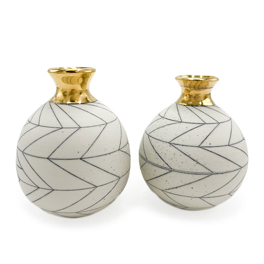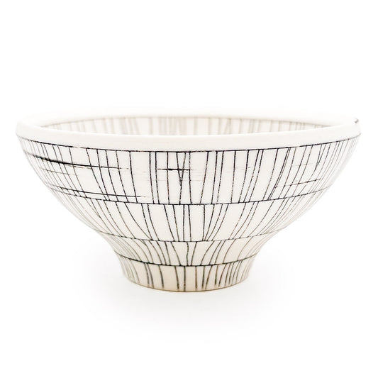 Bianka Groves received her BFA from Corcoran College of Art & Design (Washington, DC). Her work is simple and calm; it is intended to add balance to a fast-paced world. There is a bold contrast between the white of the porcelain and the incised black lines but her sense of touch is very delicate. Groves uses an inlay process, which entails covering the piece in wax and drawing through it with razors or acupuncture needles to achieve a thin, constant line, painting the carved areas in black glaze, and wiping away anything that is not in the lines. This creates a tattoo-like effect on the clay. Her high-fire porcelain wares are polished after firing to create a satiny, soft touch, each piece revealing her hand at play.