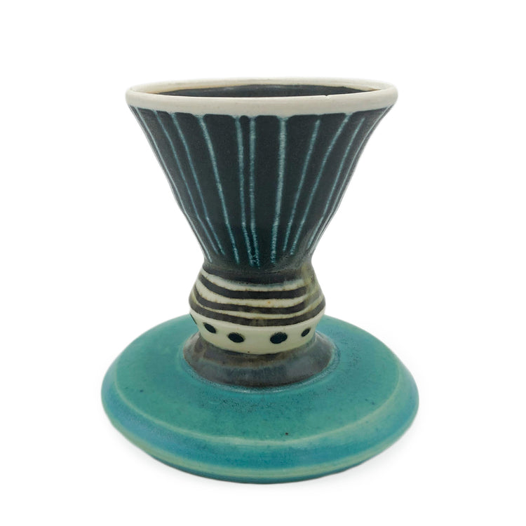 Delores Fortuna began her life on a dairy farm in northern Wisconsin. At 14 months, she contracted polio, and after rehab, eight orthopedic operations, braces, and crutches, she overcame paralysis by age 16. When she was introduced to wheel throwing in college, Fortuna was able to physically understand the pleasures of moving without pain through her hands’ interaction with the spinning clay. She received her BFA and MFA in ceramics from the University of Chicago where she studied under Ruth Duckworth. She then went on to teach at Antioch University, St. Xavier University, Chicago, and the School of the Art Institute of Chicago before retiring in 2015 to her own studio practice. She enjoys the scientific nature of ceramics and formulates her own porcelain clay body and glazes. Her work continues to involve the gestural movement she initially fell in love with. Through layering historical context, natural colors, and her experiences, Fortuna reimagines the staples of everyday use.