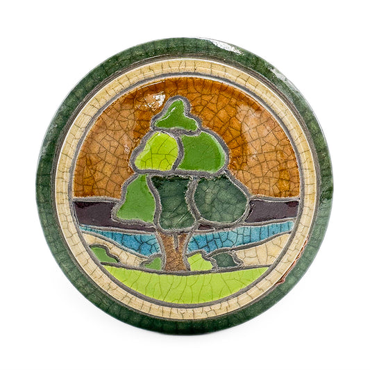 Richard Gruchalla and Carrin Rosetti are a husband-and-wife collaborative team making wheel-thrown and handbuilt Raku-fired pottery. They each bring separate skills to their finished work. Gruchalla is an accomplished clay worker with over 50 years of experience as a professional potter. Rosetti is a trained fiber artist. Over 30 years ago, she brought her vision as a colorist and her exceptional skill in the presentation of fine detail to the clay studio. Both artists contribute to the completion of almost every piece they produce. Gruchalla is responsible for the wet-working of the pottery; wheel throwing, slab construction, burnishing, or the addition of extra texture and carving. He also does the actual firing of the pieces in the Raku kiln. Rosetti takes care of the detailed glazing of the carved surfaces and collaborates with Gruchalla on forms, glazes, studio output, and marketing. Pieces are sometimes passed back and forth several times before they are completed. Final embellishments include the addition of copper wire, metallic leaf, and small wooden pegs. Their pieces are intended to be decorative objects rather than functional because they are softer than stoneware, thus more fragile. They are food-safe, but not necessarily watertight.