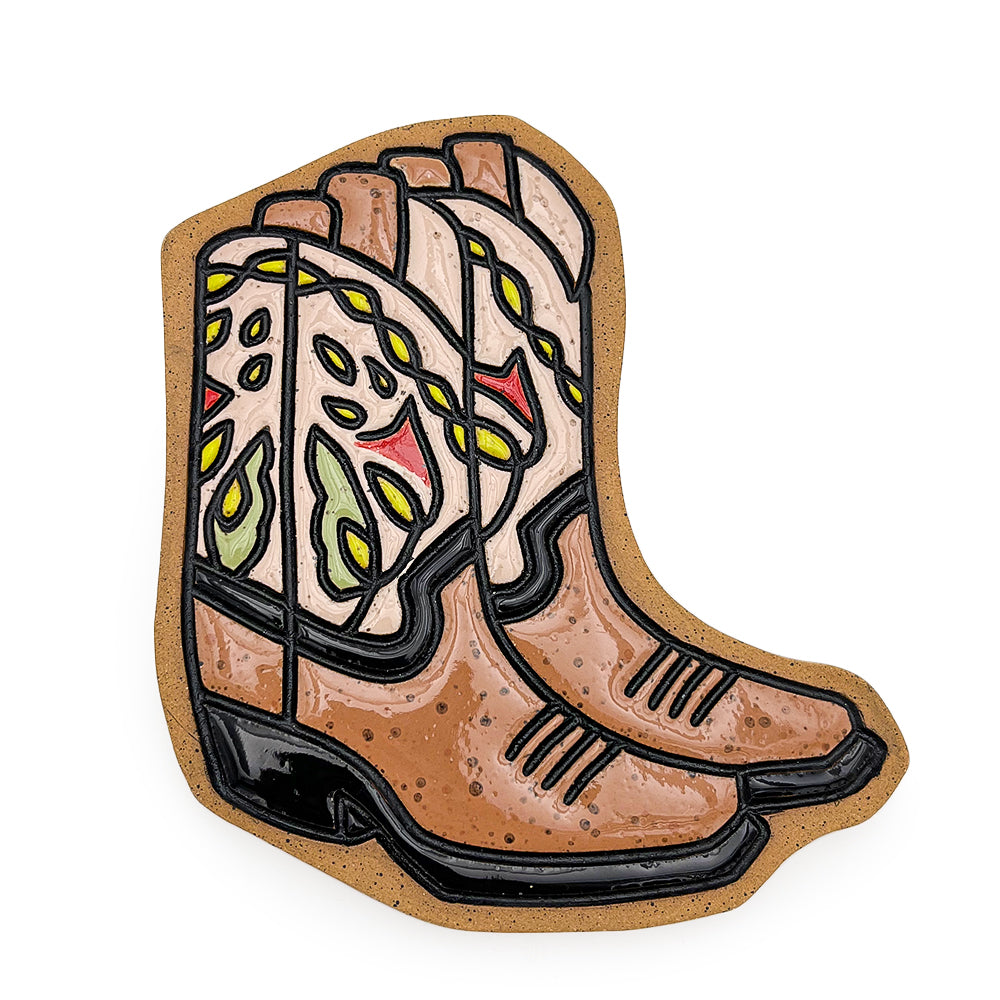 Handmade ceramic tile with pair of boots. 0.5" x 7.25" x 6.25"