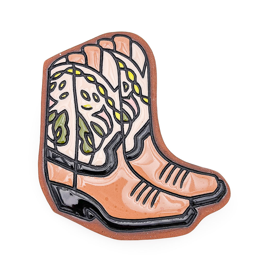 Handmade ceramic tile with pair of boots. 0.5" x 7.25" x 6.5"