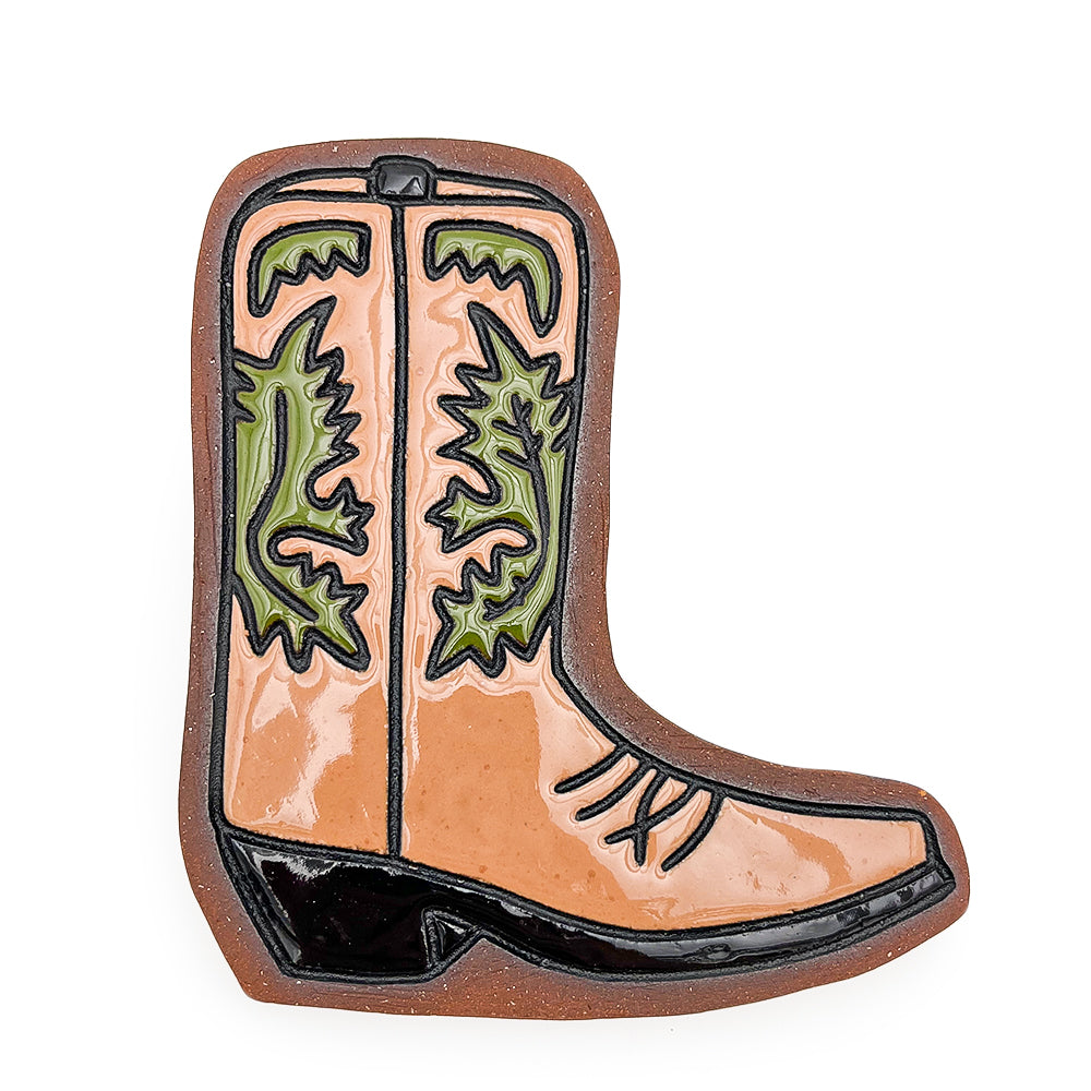 Handmade ceramic tile with brown boot and green leaves. 0.5" x 7.5" x 6.5"