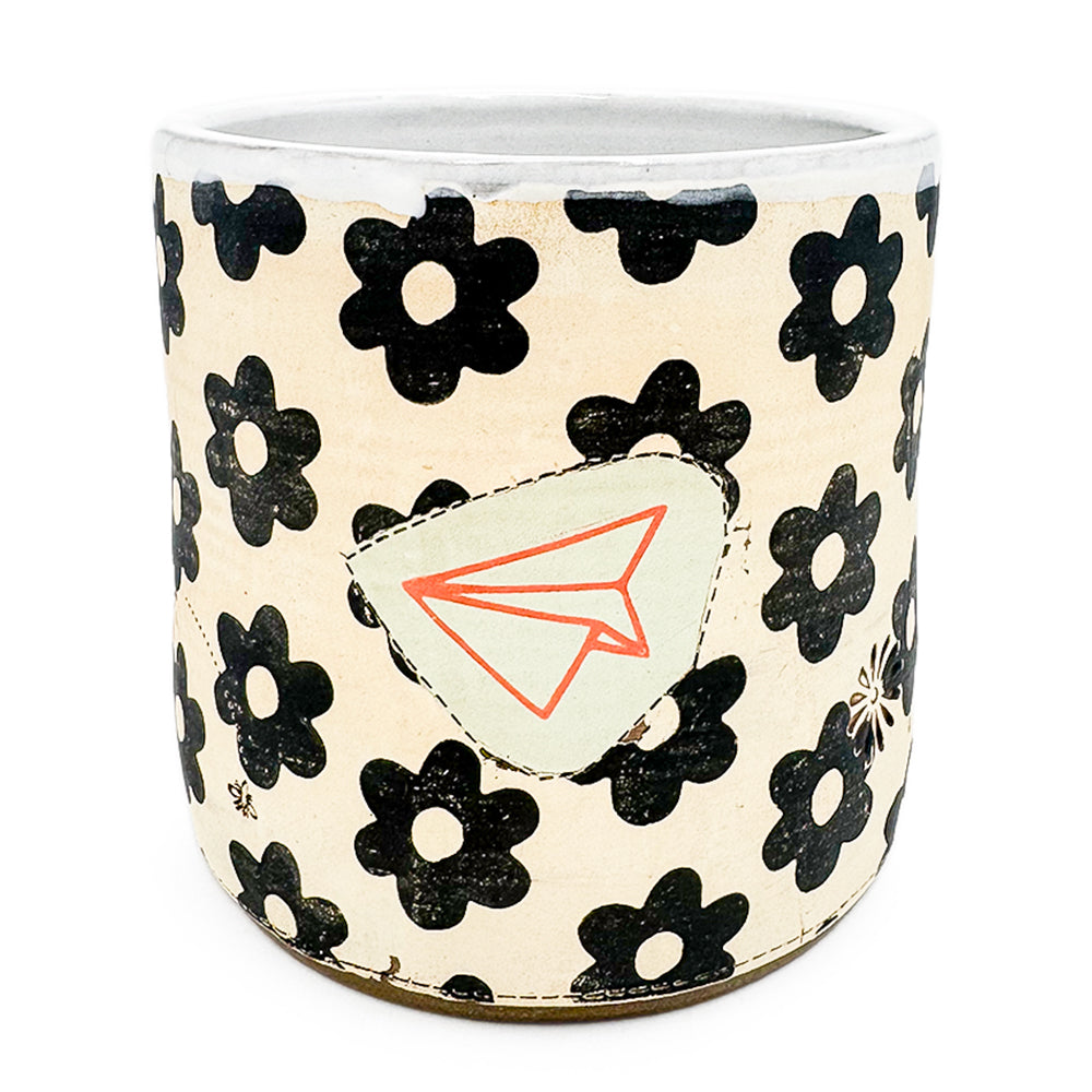 Handmade stoneware large crock with flower pattern and paper airplane.