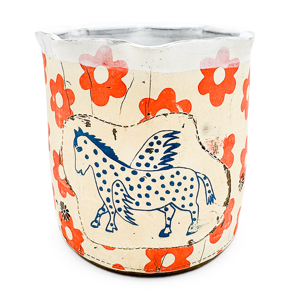 Handmade stoneware medium crock with flower pattern, pegasus, and scalloped rim.