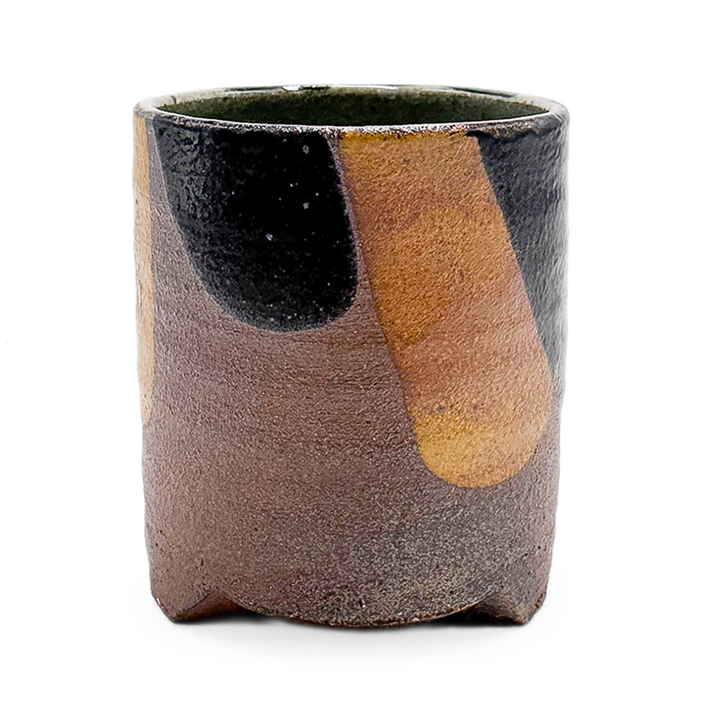 Handmade soda-fired stoneware cup with carved foot and slip decoration.