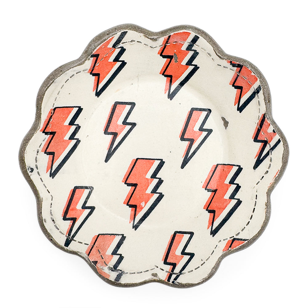 Handmade stoneware scalloped dish with lightning bolt pattern.