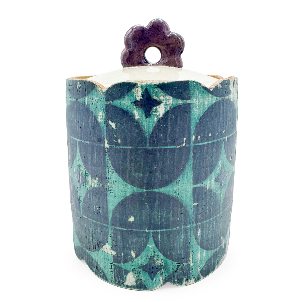 Handmade stoneware large lidded jar with purple and blue design and scalloped edges.