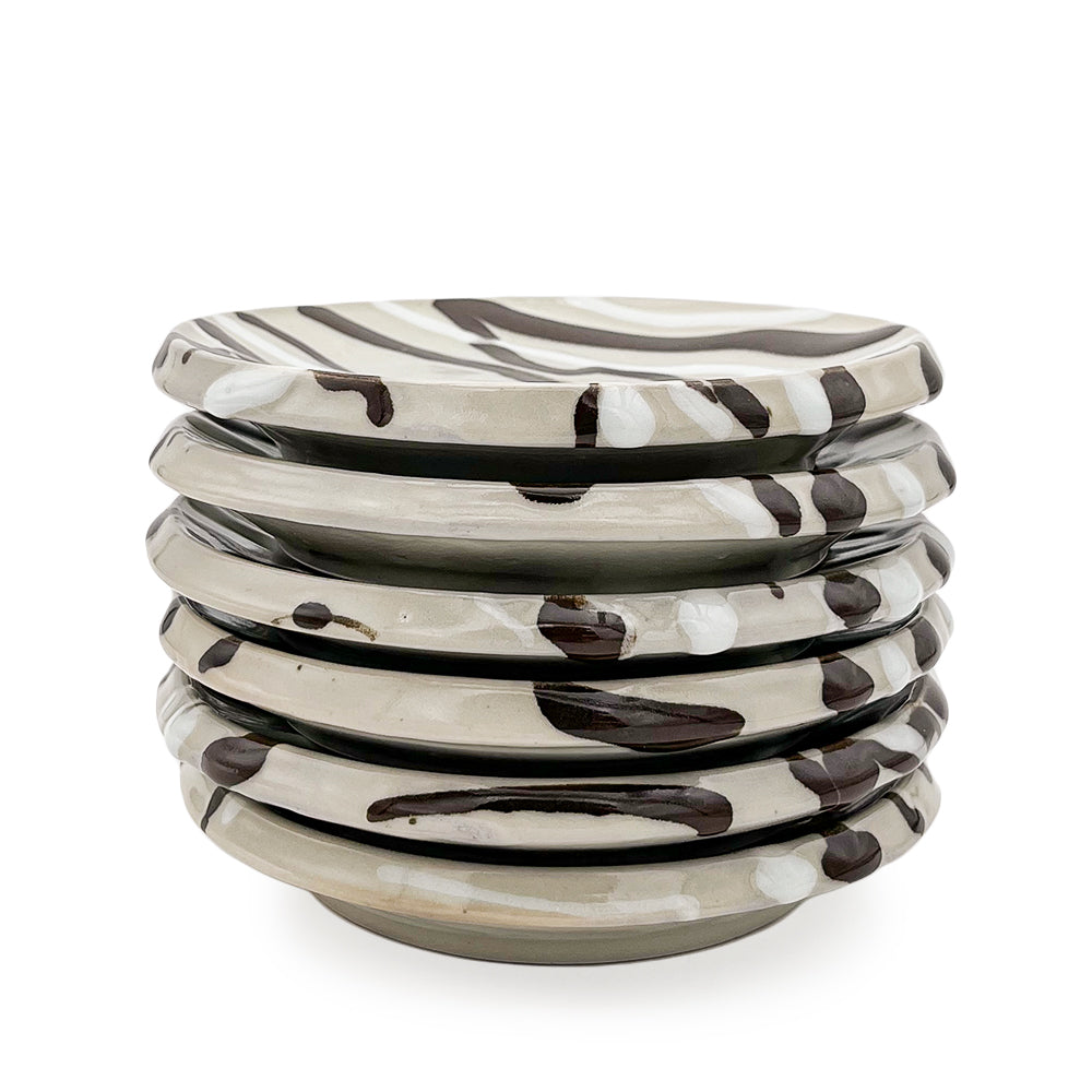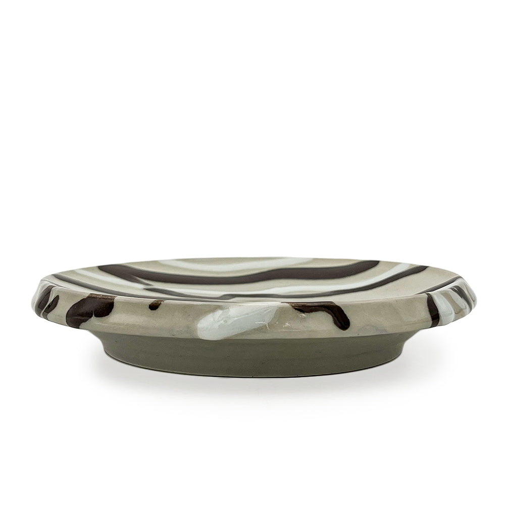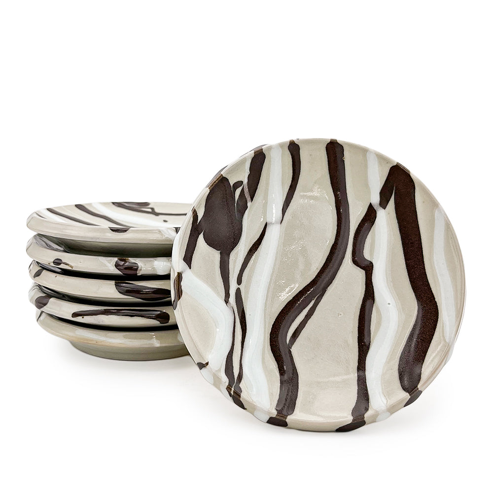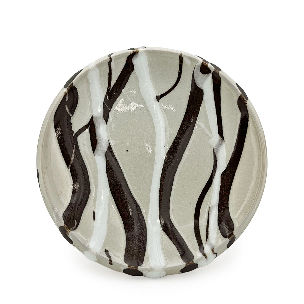 Handmade ceramic small plate with tenmoku and white ladle pours. Each plate is unique and may vary slightly from the photo. 1.25" x 7" x 7"