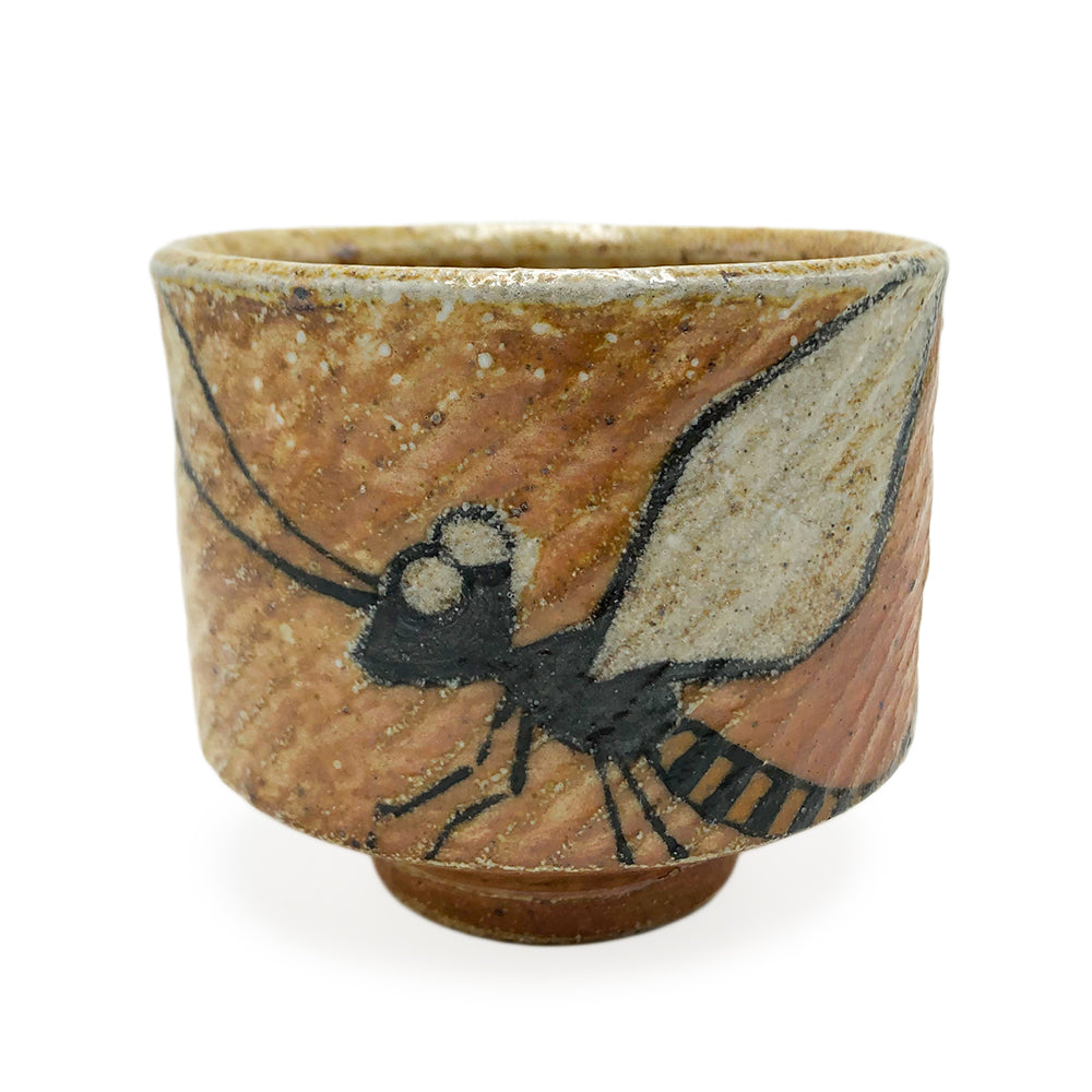 Handmade ceramic cup with rope inlay and bug image. 4" x 4" x 3"