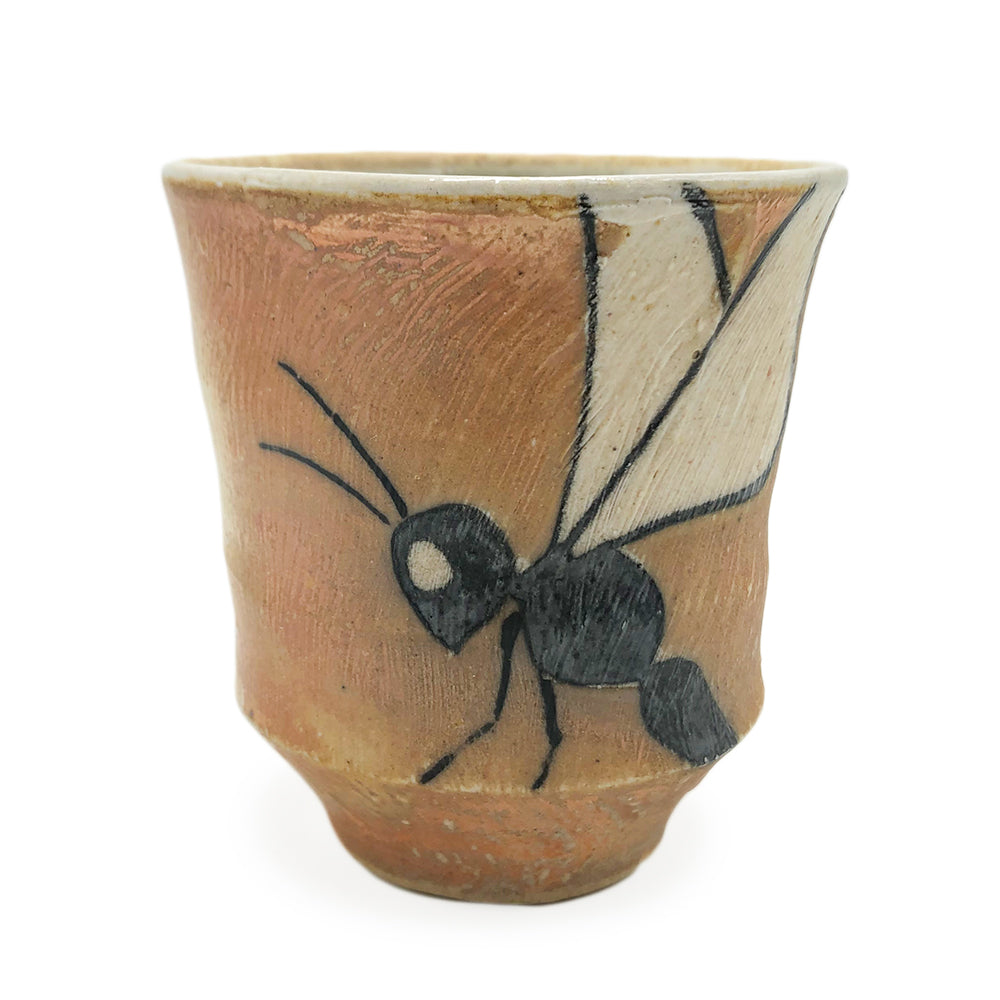 Handmade ceramic cup with brushed surface and insect image. 3.25" x 3.25" x 3.5"