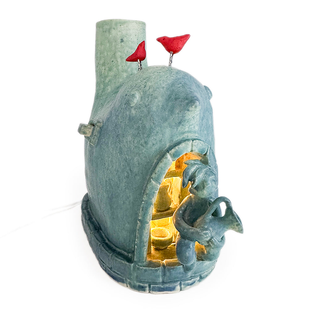 Handmade porcelaneous stoneware 'Bird Kiln' lamp in the loading stage.