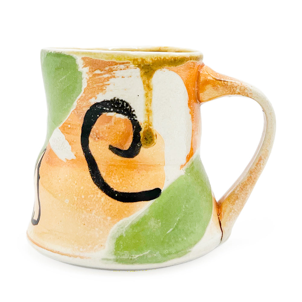 Handmade ceramic mug with yellow, green, and black design. 3.5" x 4.5" x 3.5"
