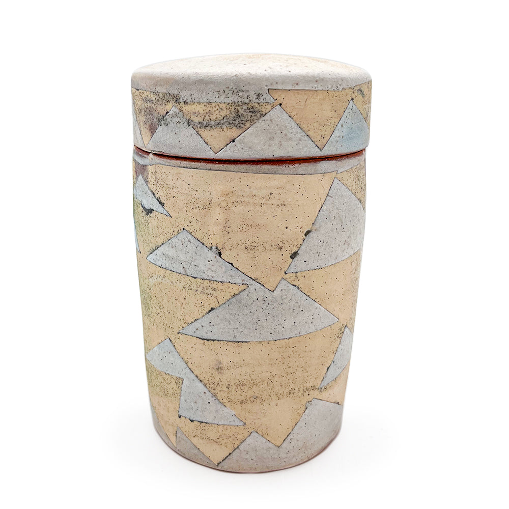 Handmade ceramic jar with triangle design. 3.75" x 3.75" x 6.25"