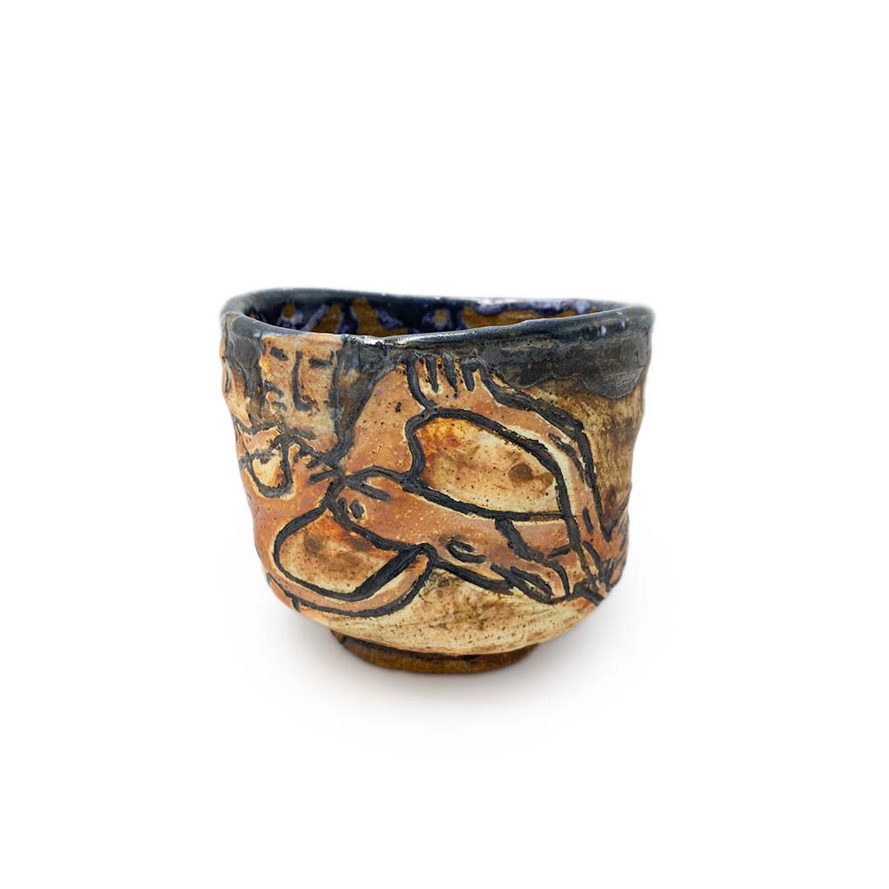 Handmade ceramic teabowl in brown/black with creatures. 4" x 4.75" x 3.5"