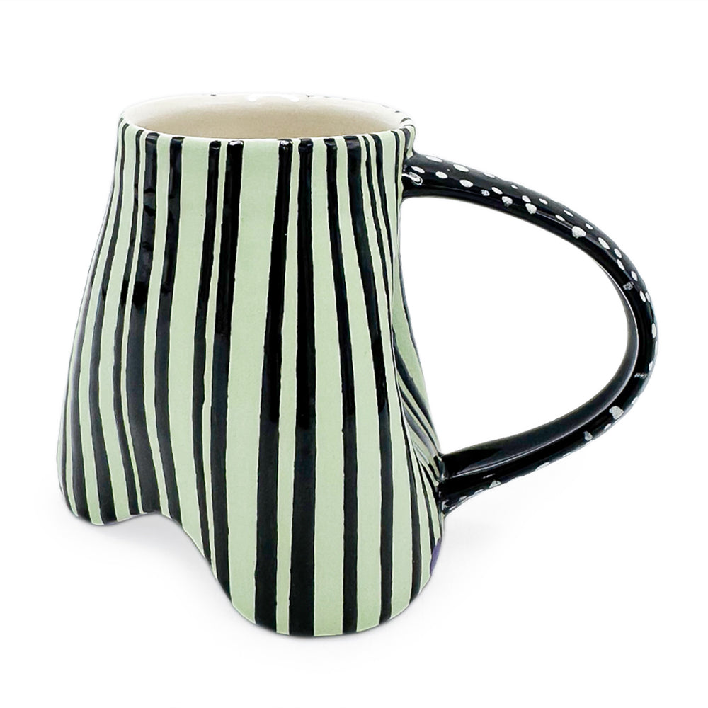 Handmade footed porcelain mug with pistachio and glossy black stripes.