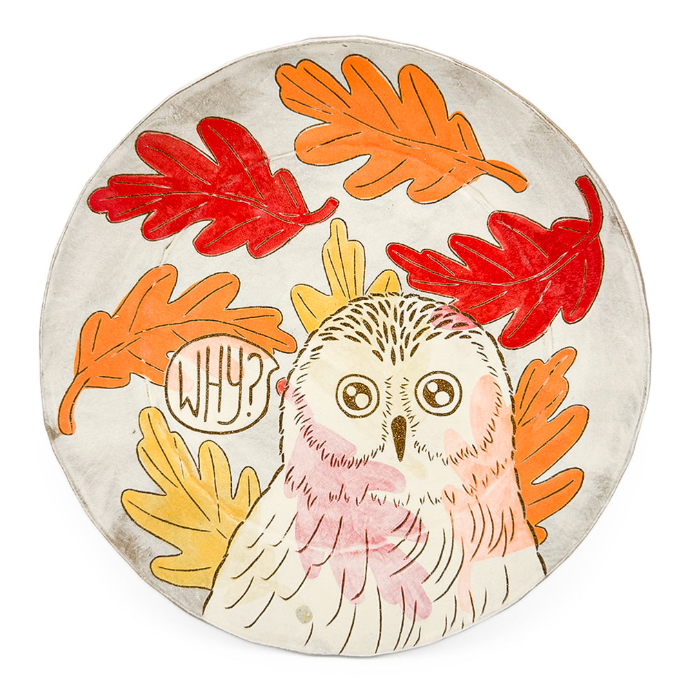 Handmade stoneware plate with 'Why', owl, and leaves.