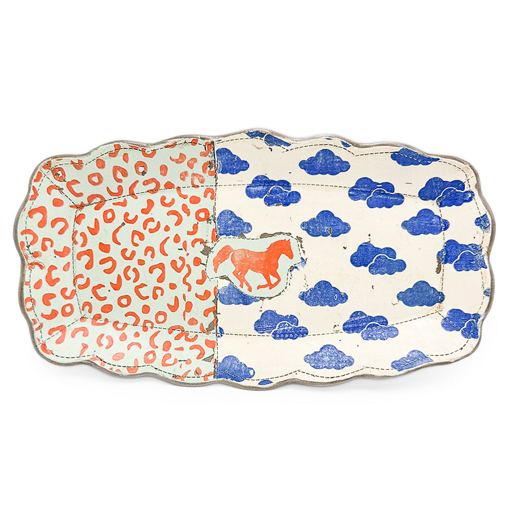 Handmade stoneware scalloped platter with horse.