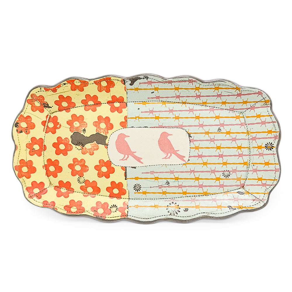 Handmade stoneware scalloped platter with barbed wire, flowers, and birds.