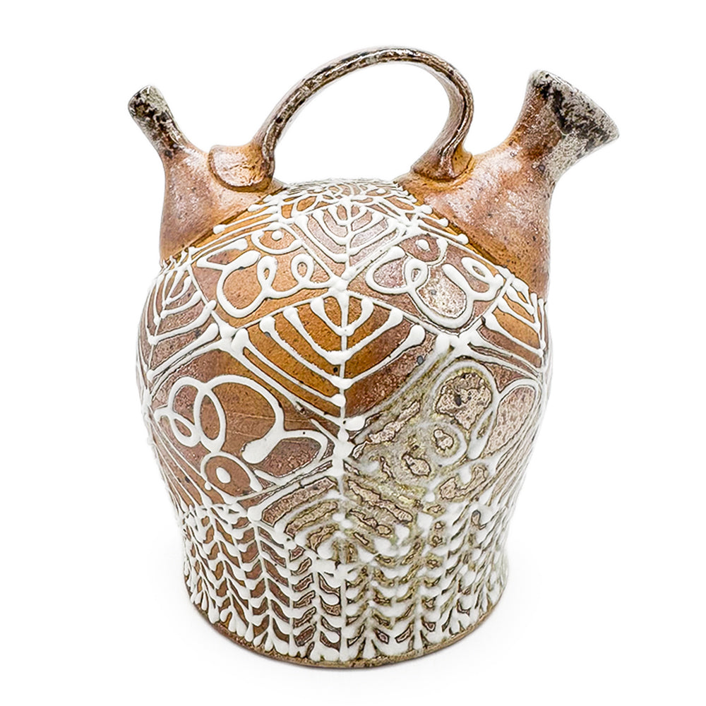 Handmade soda-fired stoneware pouring pot with slip trailing.