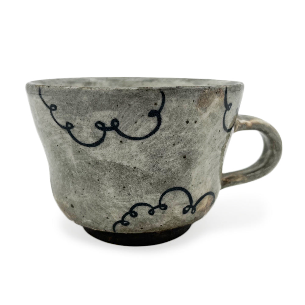 Handmade ceramic loop cloud mug with white slip and underglaze. 5" x 4" x 3"