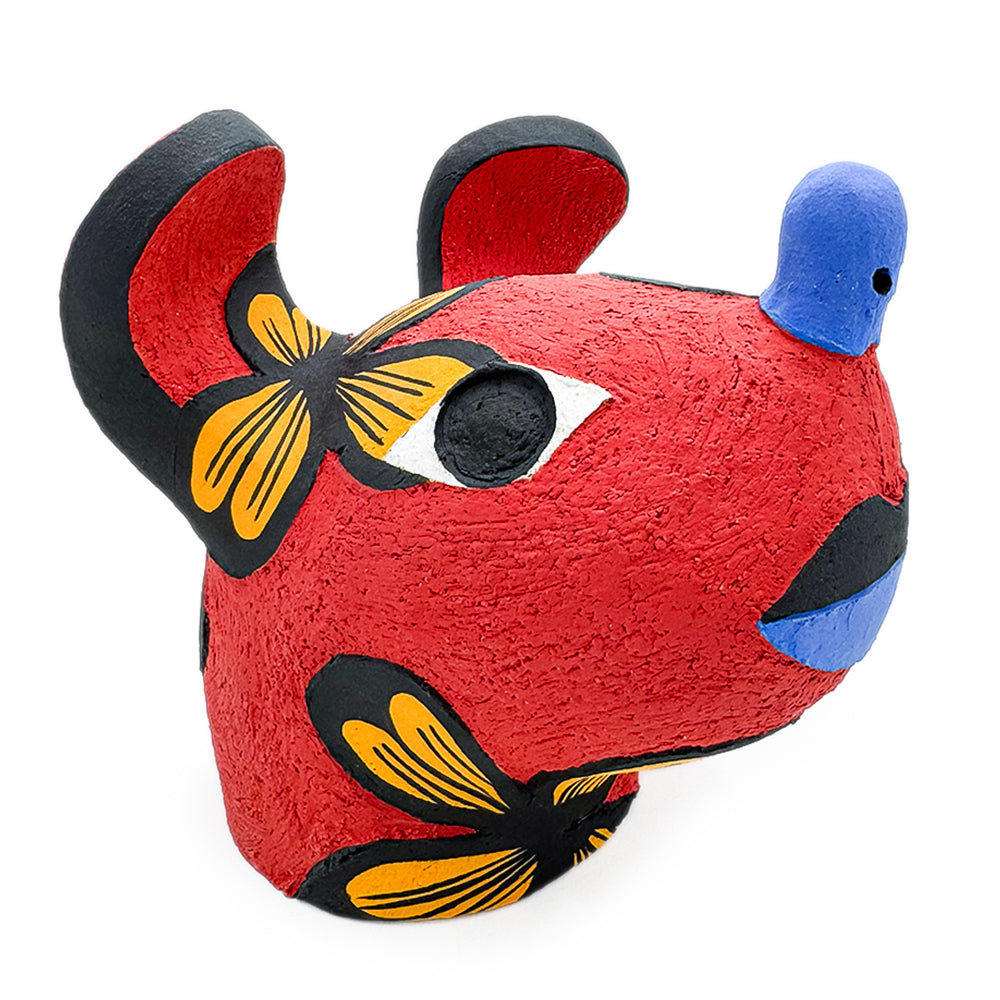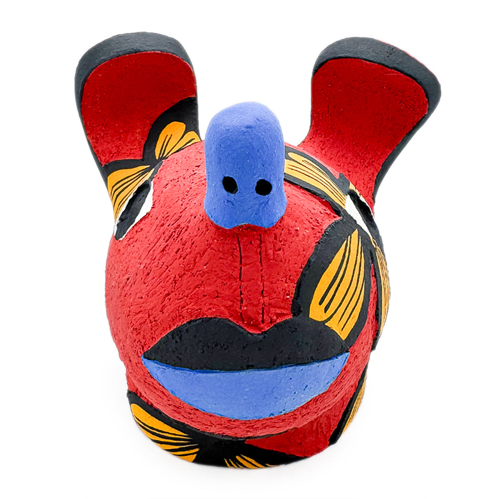Handmade stoneware 'Dog Head' sculpture with red and orange underglaze.