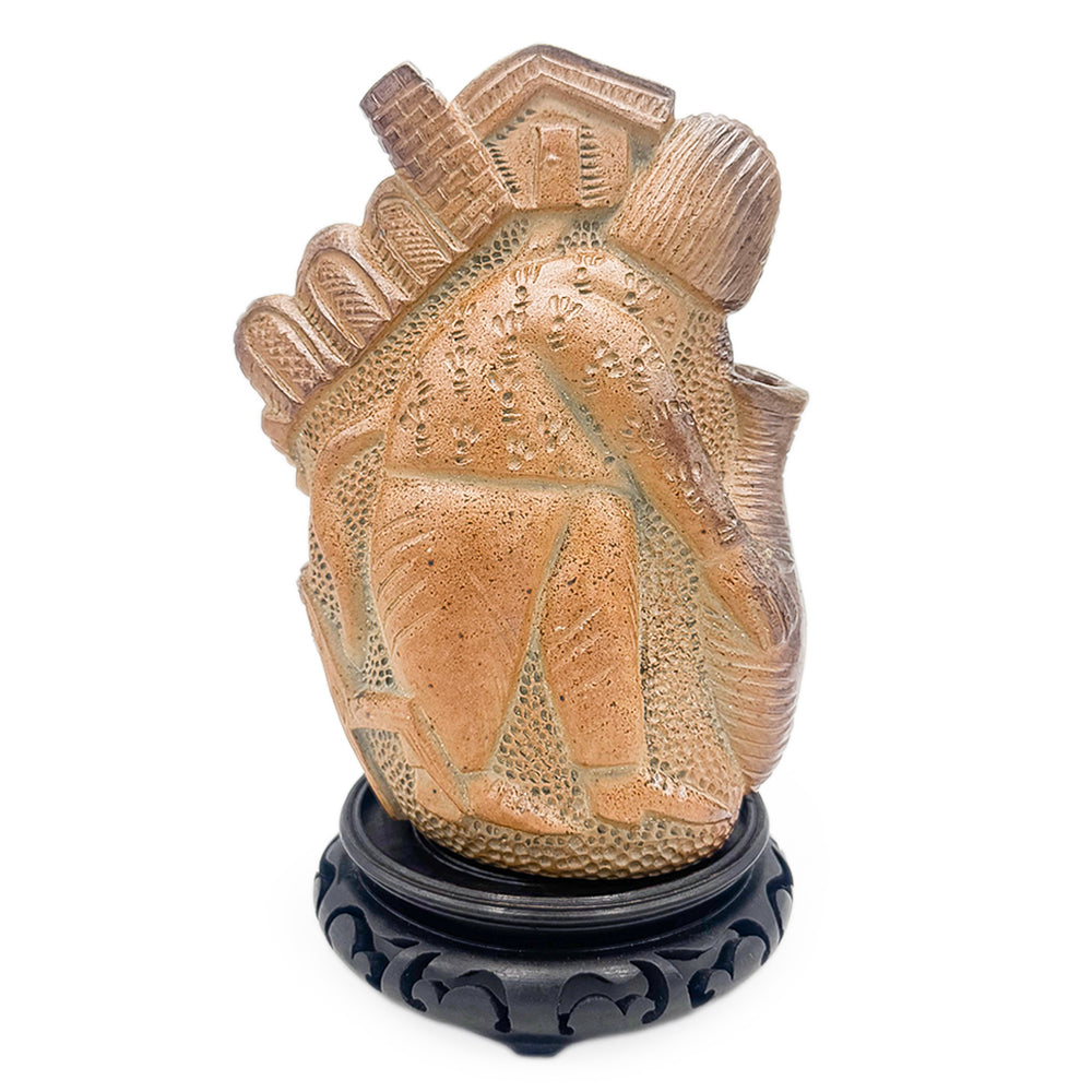 Handmade wood-fired stoneware sculpture with potter, cane, and wooden stand.