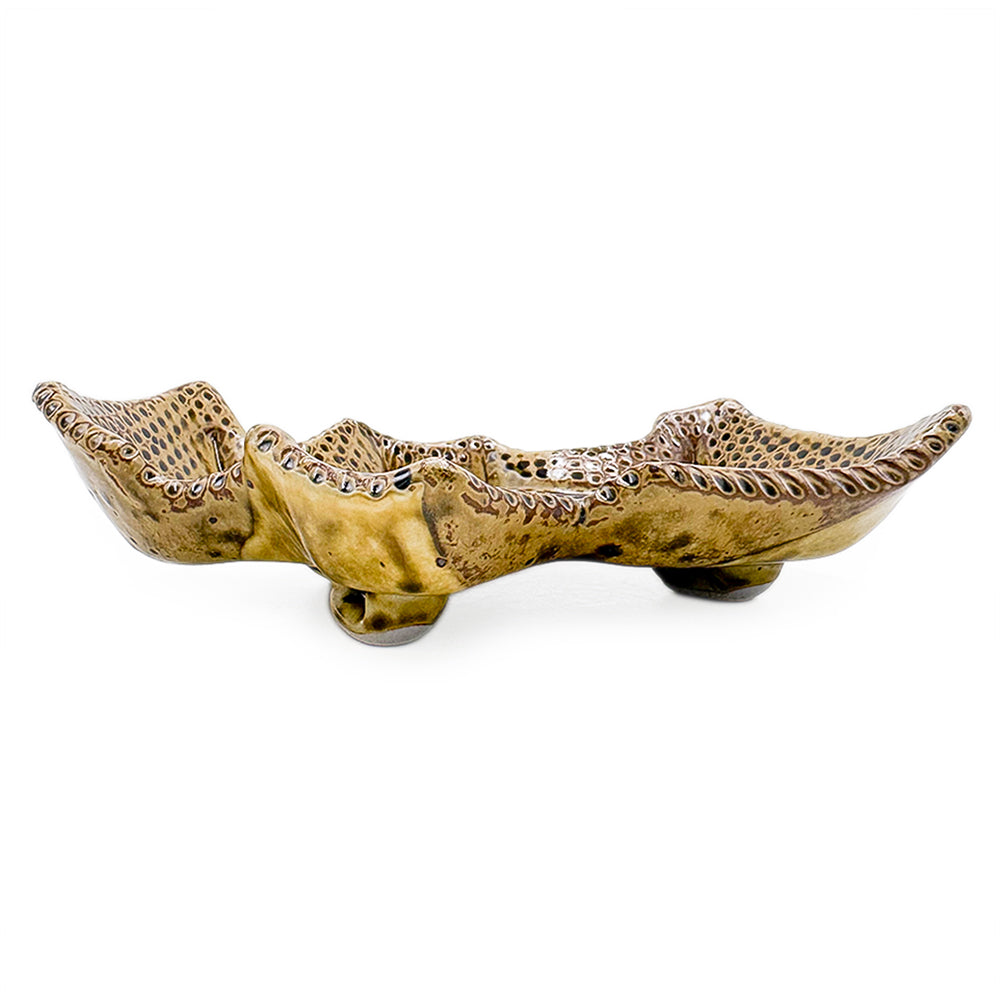 Handmade stoneware tray with dotted texture and tan glaze.