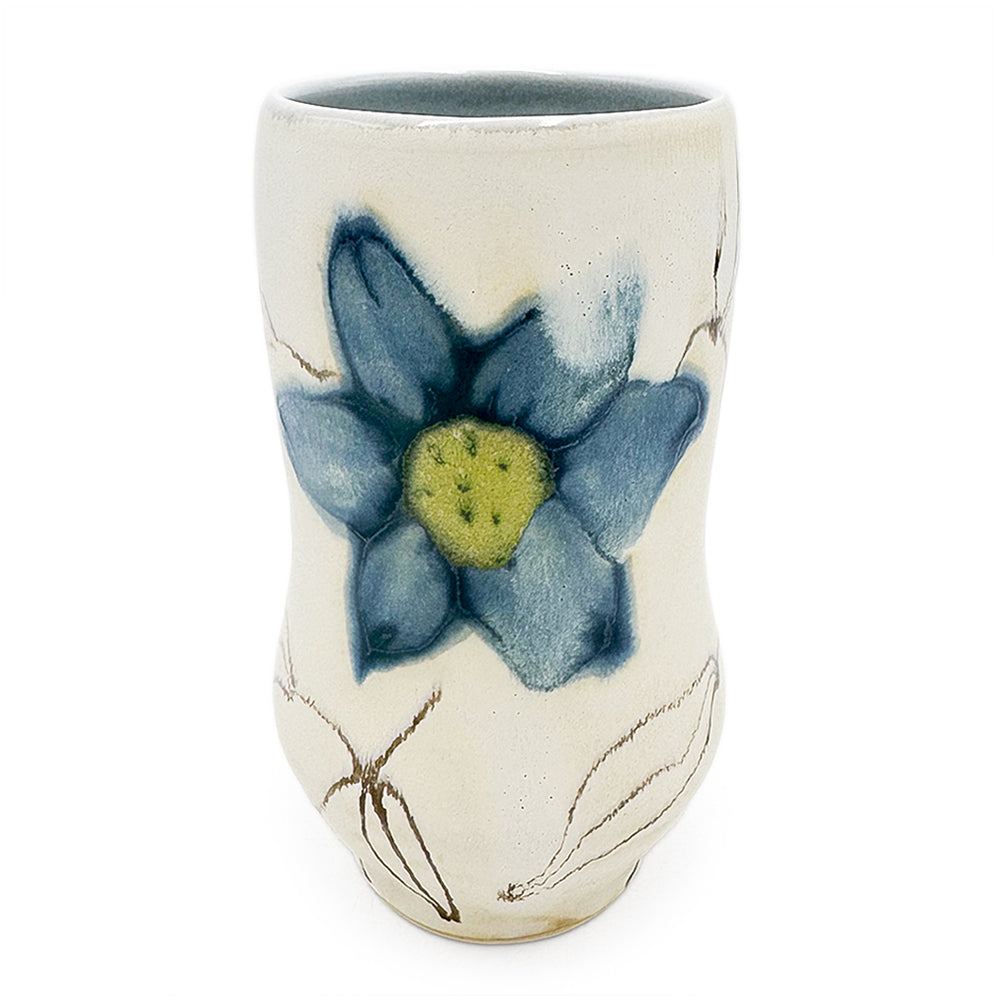 Handmade porcelaneous stoneware tumbler with cream background and teal flowers.