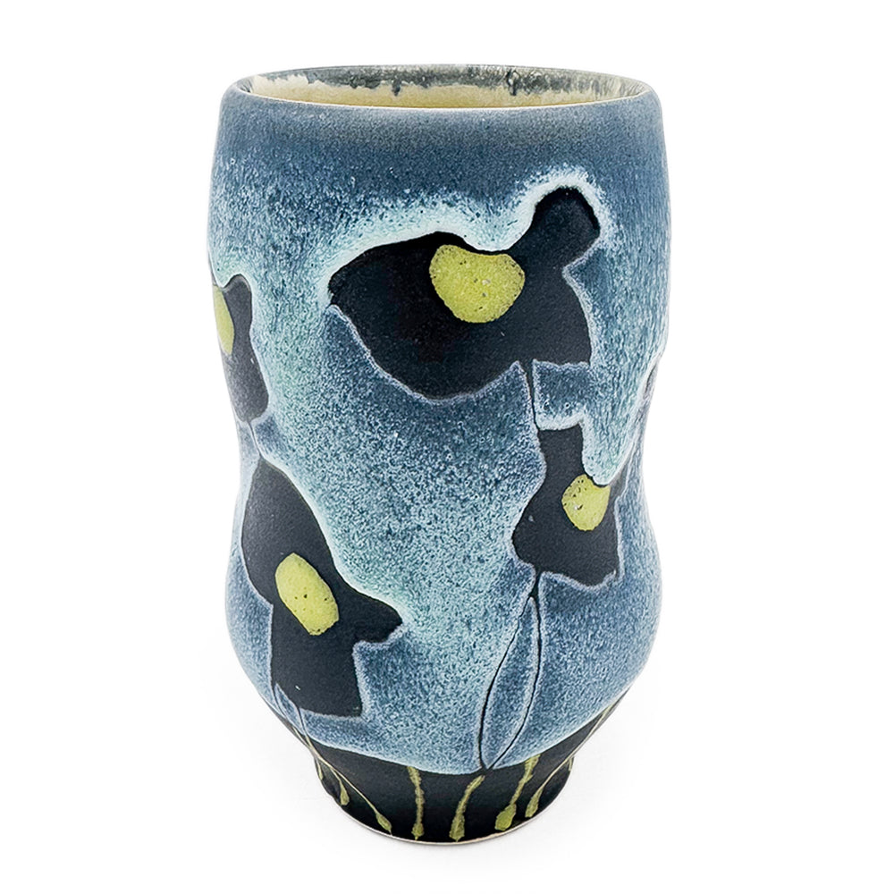 Handmade porcelaneous stoneware tumbler with twilight background and black poppies.