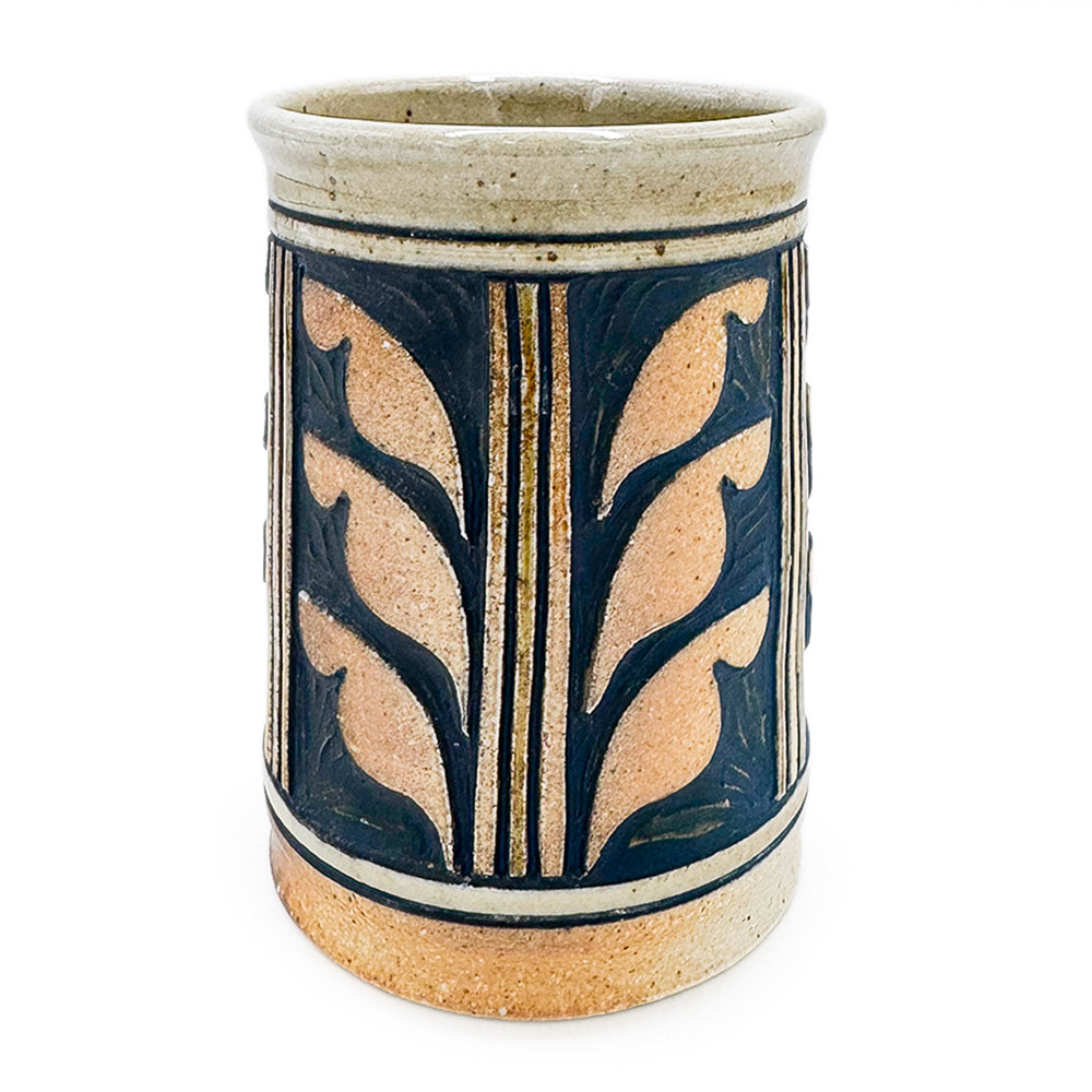 Handmade stoneware tumbler with floral carving and slip decoration.