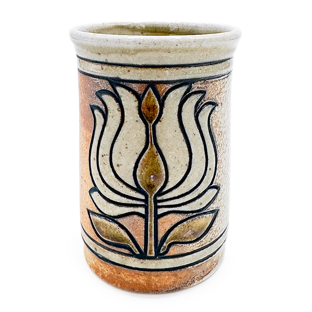 Handmade stoneware tumbler with floral carving and slip decoration.