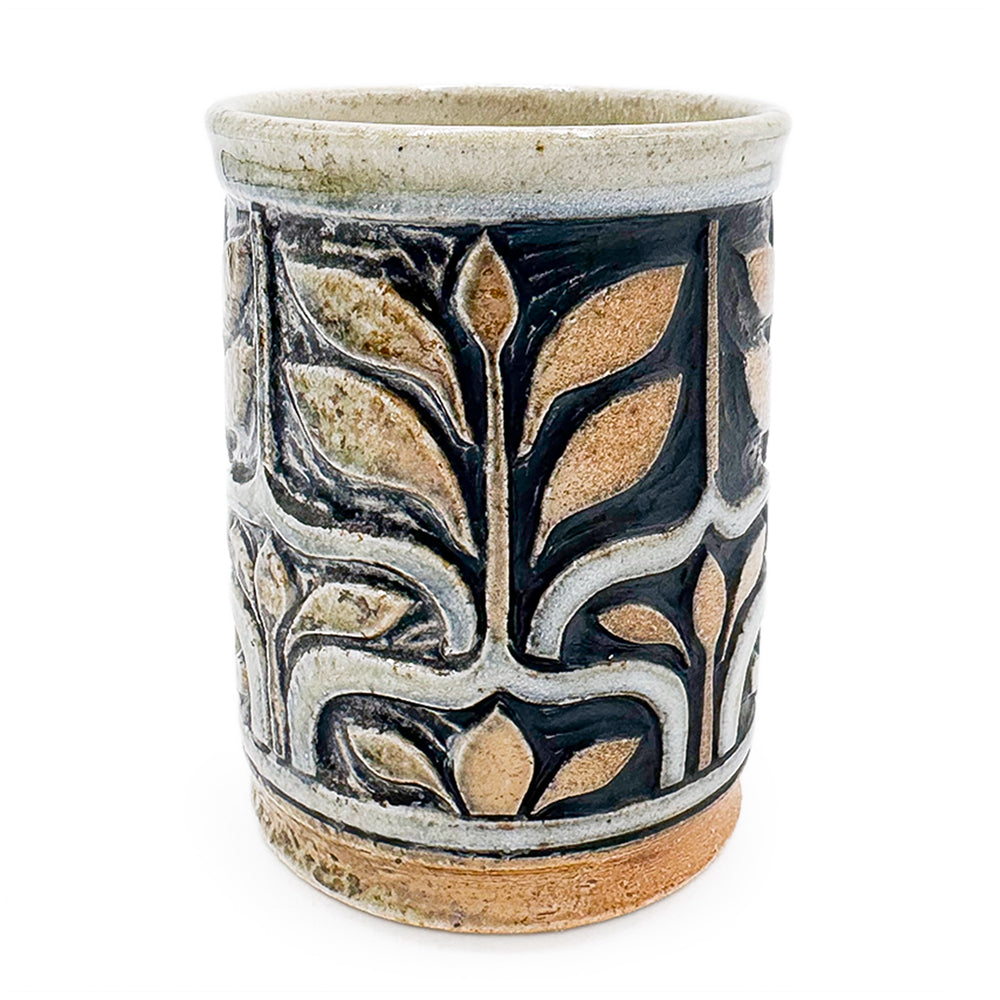 Handmade stoneware tumbler with carving and slip decoration.