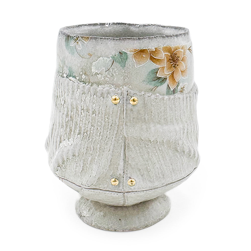 Handmade soda-fired ceramic tumbler with floral decal and luster decoration.